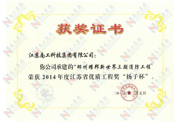 集团承建的连云港“科技创业城1-3号楼智能化系统工程”、“邳州耀邦新世纪三期消防工程”等二项工程荣获江苏省优质工程奖“扬子杯”奖(安装工程)。