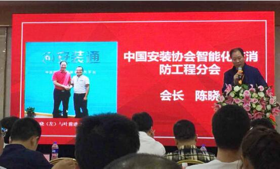 中国安装协会副秘书长顾心建代表协会致词。中国安装协会智能化与消防工程分会会长陈晓代表分会致词。