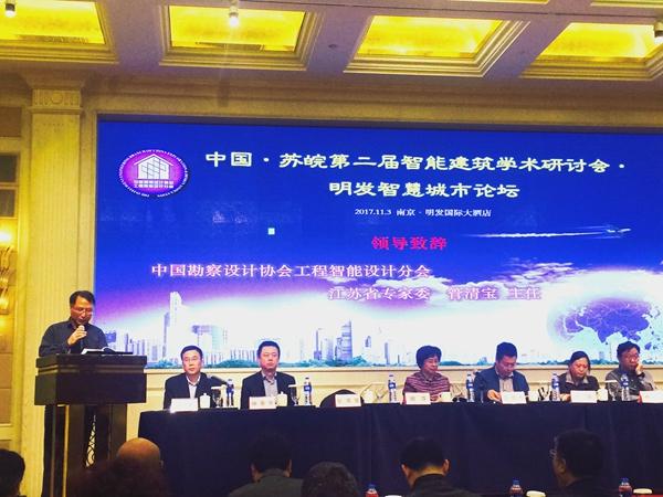 2017年11月3日,中国·苏皖第二届智能建筑学术研讨会明发智慧城市论坛在南京明发国际大酒店召开。参加研讨会的嘉宾有中国勘察设计协会智能设计工程分会会长胡萍,《数据中心数据规范》标准编写组组长钟景华,中国勘察设计协会智能设计工程分会湖北省专家委员会主任熊江、安徽省专家委员会主任万力、山东省专家委员会主任张钊、江苏省专家委员会主任管清宝,江苏南工科技集团有限公司执行董事陈俊桦及集团副总经理吴雪峰等近300多人参加了研讨会。