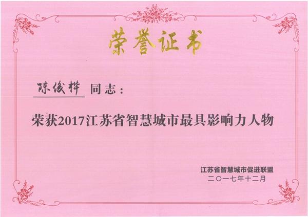 会议颁发了江苏省智慧城市联盟评选的“江苏省智慧城市最具影响力人物奖、江苏省智慧城市先锋人物奖、江苏省智慧城市领军企业奖”等奖项。江苏南工科技集团执行董事陈俊桦获“2017江苏省智慧城市最具影响力人物奖”。