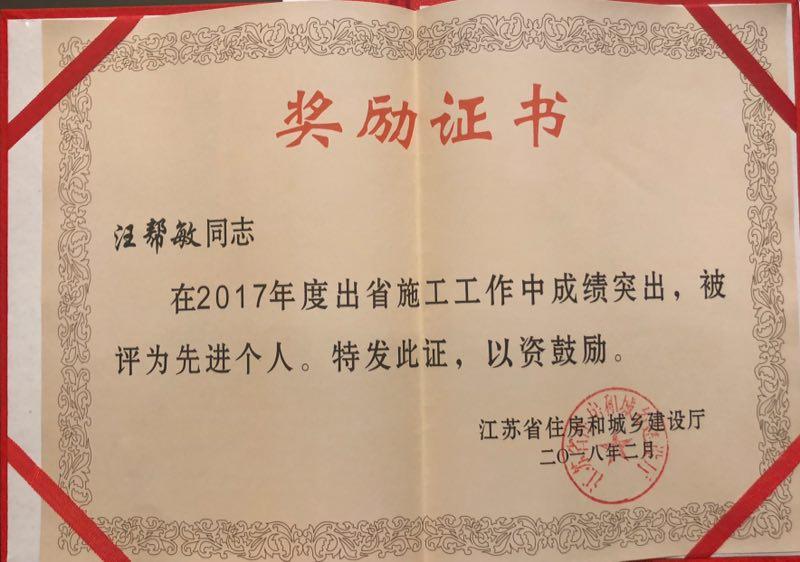 2018年3月25日,江苏省住房和城乡建设厅出省施工企业先进集体和个人西南地区表彰大会在重庆隆重召开。江苏南工科技集团有限公司总经理助理兼重庆分公司总经理汪帮敏荣获2017年度出省施工工作“先进个人”称号。