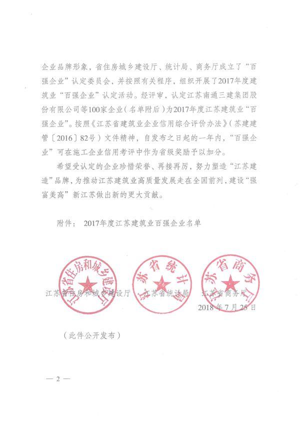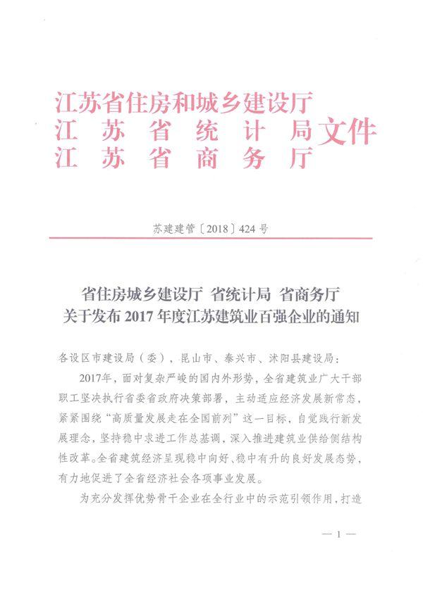近日,江苏省住房城乡建设厅、江苏省统计局、江苏省商务厅联合发布2017年度全省建筑业“百强企业”名单,江苏南工科技集团有限公司以出色的成绩荣登百强企业榜单。