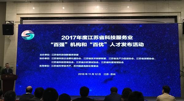 2018年11月12日,2017年度江苏省科技服务业“百强”机构和“百优”人才发布活动在苏州清山会议中心举行。参加会议的有江苏省科技厅副厅长景茂,江苏省科技厅科技机构与条件处副处长李汉中,江苏省科技创新服务联盟理事长、省生产力促进中心主任赵志强,苏州高新区管委会副主任陶冠红,苏州高新区管委会科创局局长顾彩亚等领导及专家和各百强机构人才代表。江苏南工科技集团有限公司副总经理吴雪峰参加了会议。