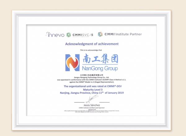 2019年1月11日,在江苏南工科技集团有限公司会议室举行的CMMI3级认证结果发布会上,高级评估师Jesus Sanchez 向公司高层及参与评审的项目组成员郑重宣布:经过严格的现场审核和评估,江苏南工科技集团有限公司已经达成了CMMI3级目标,成功通过CMMI3级认证。