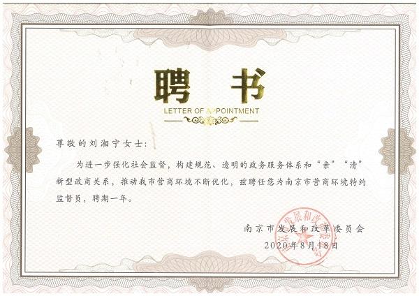 宗明副处长代表南京市税务局为刘湘宁副总经理颁发了《南京市营商环境特约监督员》聘书,宗明副处长、贾振祥副局长分别作了讲话,希望刘湘宁同志在担任南京市营商环境特约监督员期间,担负好政企联络、政策宣传及政府监督职责工作,为进一步构建规范、透明的政务服务体系和“亲”“清”新型政商关系,强化社会监督,推动我市营商环境不断优化做出努力和贡献。