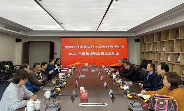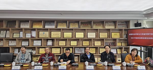 2021年4月20日,金陵科技学院与江苏省安装行业协会联合招生座谈会在江苏南工科技集团有限公司召开。参加座谈会的有金陵科技学院继续教育学院院长陈玉林、学历教育科主任黄一兵,金陵科技学院机电学院院长鞠全勇、楼宇系主任牟福元、办公室主任张玉、项目负责人姜玉东,江苏省安装行业协会会长助理顾建生、副会长陈晓、秘书长吴辉、副秘书长席天阳,江苏省安装行业协会智能化与消防工程分会副秘书长余晶、办公室主任陈怡帆等。