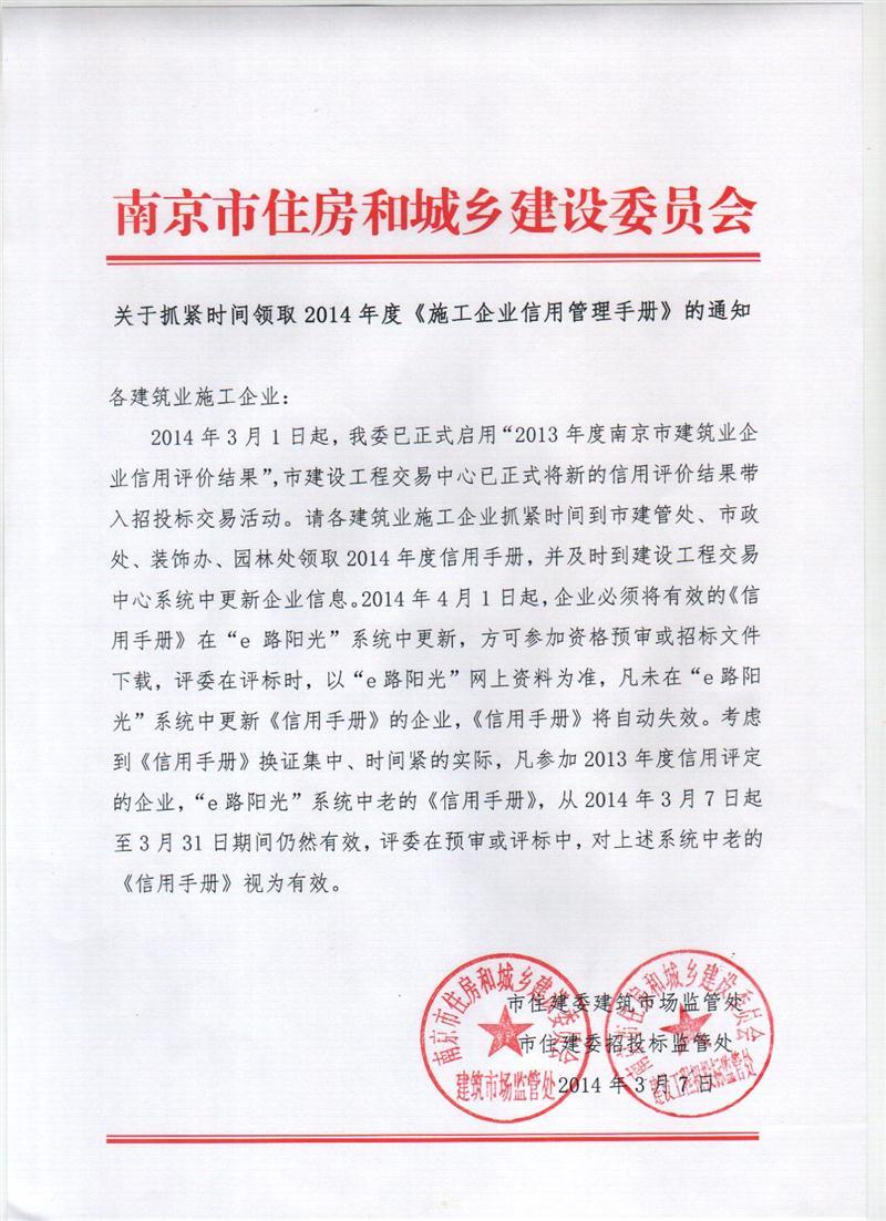 关于抓紧时间领取2014年度《施工企业信用管理手册》的通知