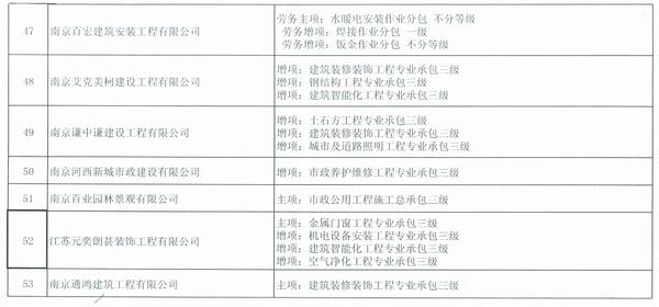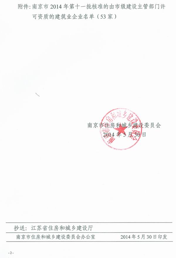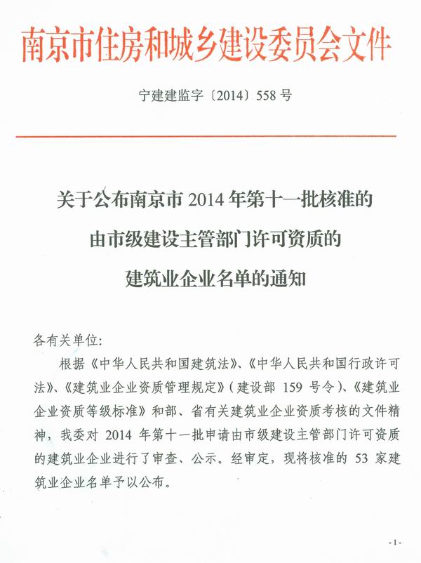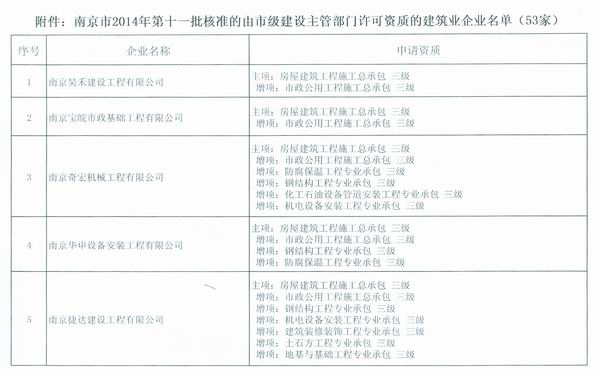 关于公布南京市2014年第是一批核准的由市级建设主管部门许可资质的建筑业企业名单的通知